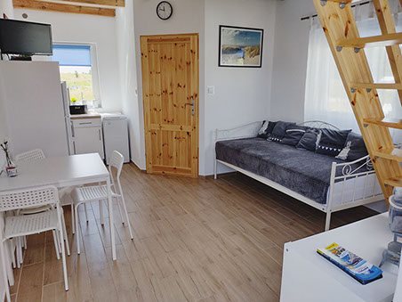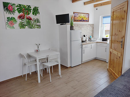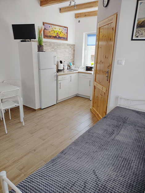 Salon połączony jest z częścią kuchenną i wyposażony jest w stolik z krzesłami, TV 24 cale oraz kanapą umożliwiającą spanie dla jednej dorosłej osoby.