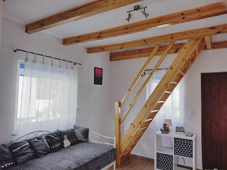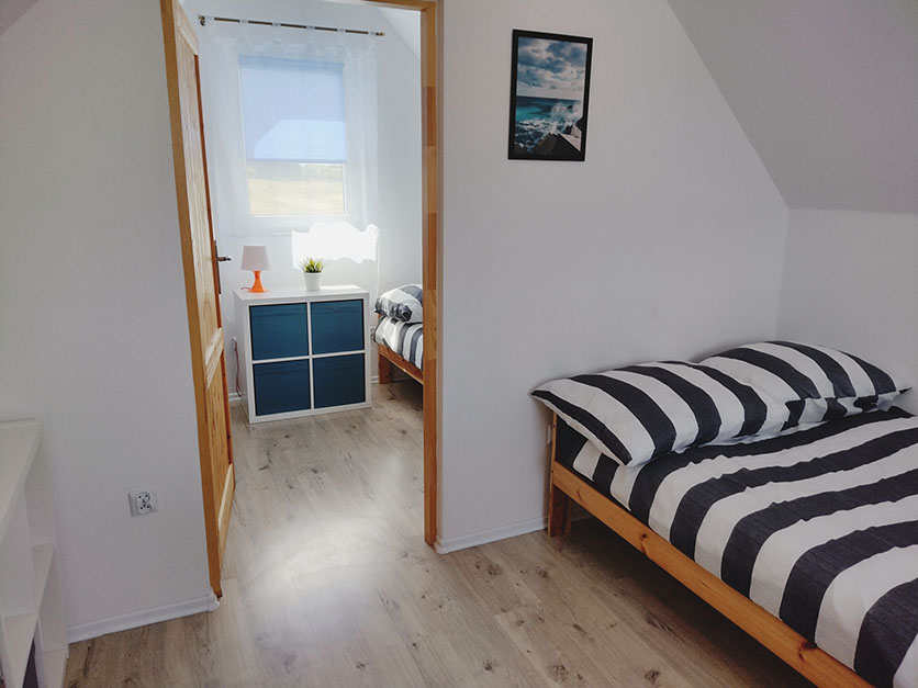 Dwie sypialnie zlokalizowane są na piętrze budynku i wyposażone są w wygodne łóżka, meble do przechowywania odzieży. W jednej z sypialń znajduje się łóżko o wymiarach 90x200 i 120x200, w drugiej niezamykanej sypialni znajduje się łóżko o wymiarach 120x200