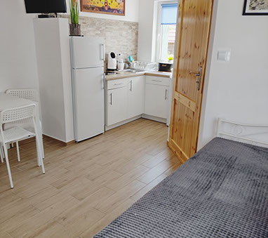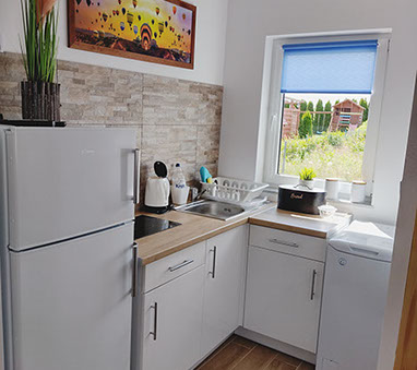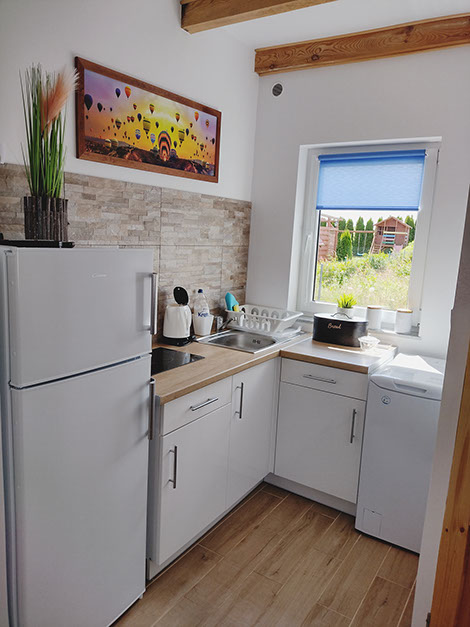 Na wyposażeniu kuchni znajduje się płyta elektryczna, lodówka z zamrażalnikiem, czajnik bezprzewodowy, komplet garnków i patelni, naczynia, sztućce oraz niezbędny sprzęt potrzebny do przygotowania posiłków.