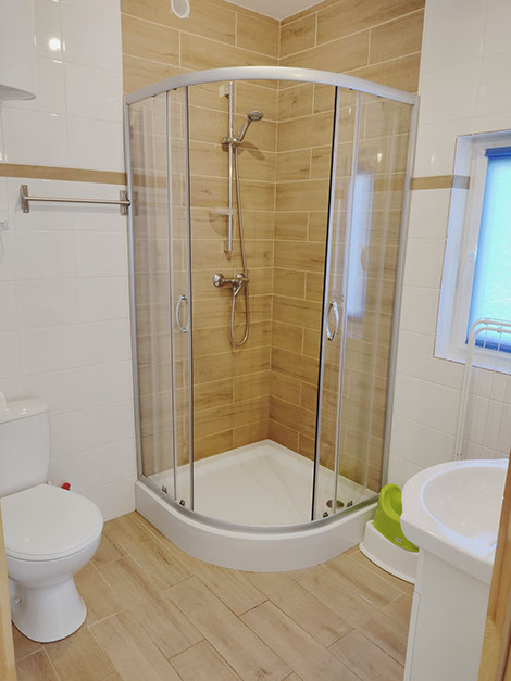 Łazienka wyposażona jest w kabinę prysznicową, WC, nowoczesną pralkę o obrotach 1000 oraz suszarkę stojącą na bieliznę.